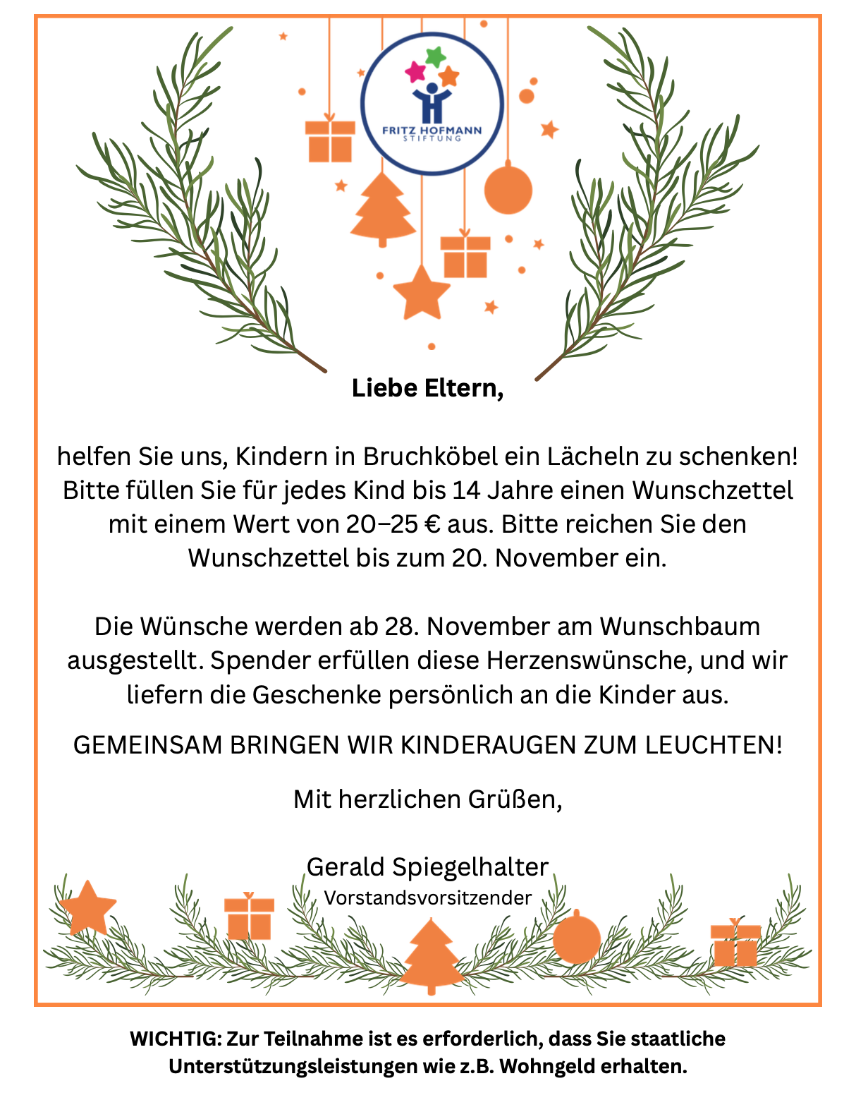 Die Fritz-Hofmann-Stiftung darf finanzielle Unterstützung nur gewähren, wenn bestimmte Voraussetzungen erfüllt sind. Das betreffende Kind ist noch keine 14 Jahre alt. Es hat seinen Wohnsitz in Bruchköbel und besitzt die deutsche Staatsbürgerschaft. Oder es ist aufgrund einer besonderen Notlage, wie zum Beispiel Flucht oder Vertreibung aufgrund kriegerischer Auseinandersetzung, in Bruchköbel untergebracht. Außerdem liegt eine finanzielle Bedürftigkeit vor.